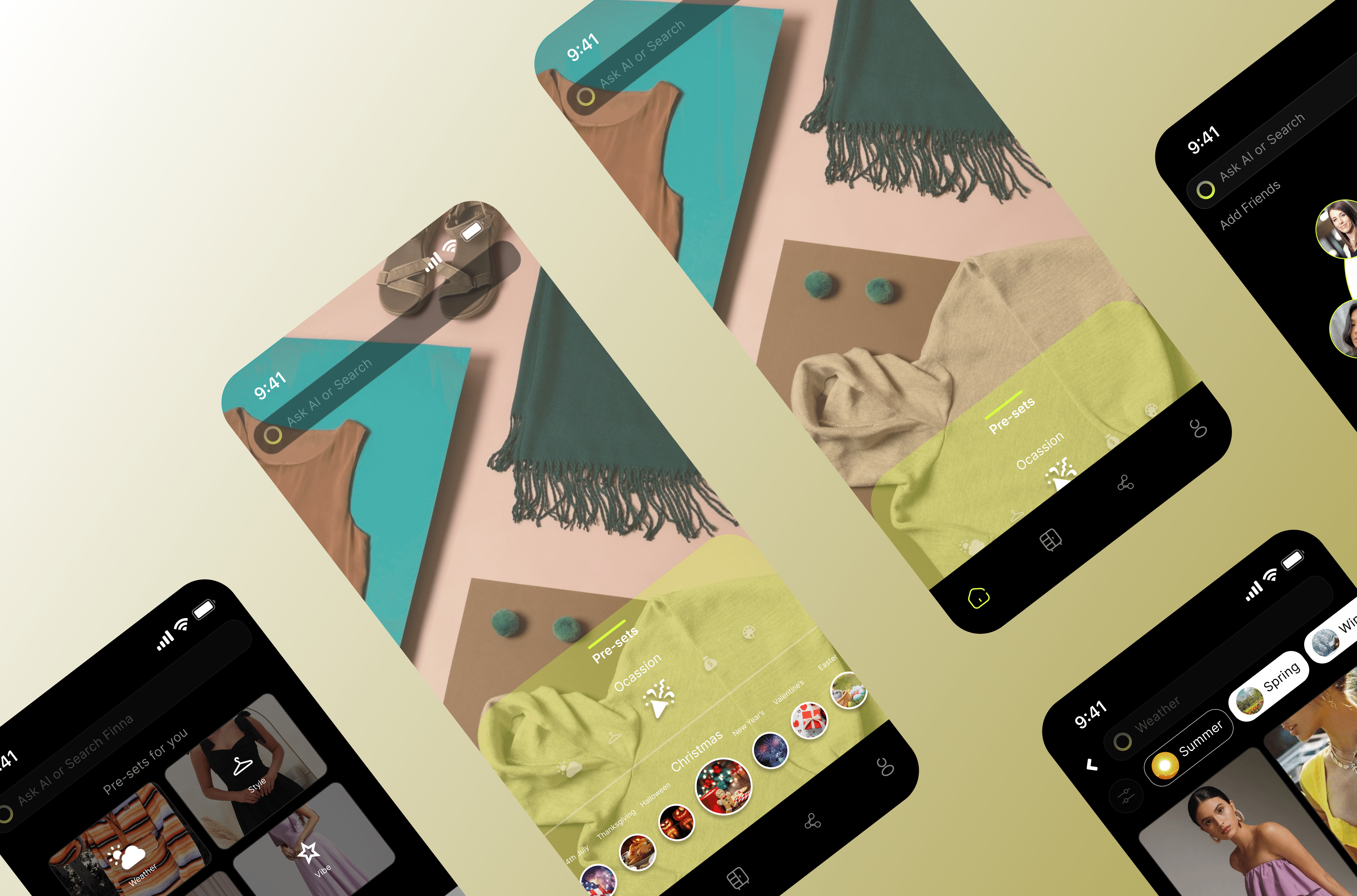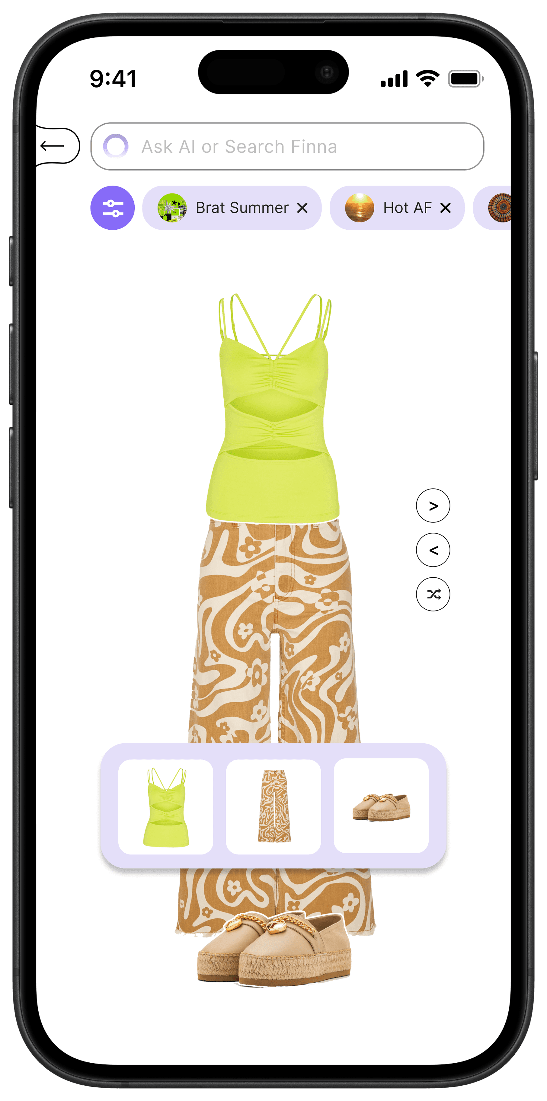 Instead of starting with categories, users begin by selecting presets (occasion, weather, vibe) that translate abstract preferences into clear styling constraints. Finna then generates full outfits, allowing users to preview, refine, and move directly into purchase.